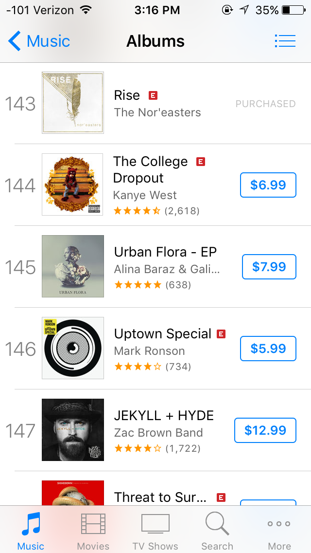 RISE Peaked at #112 on the iTunes Top Albums Charts